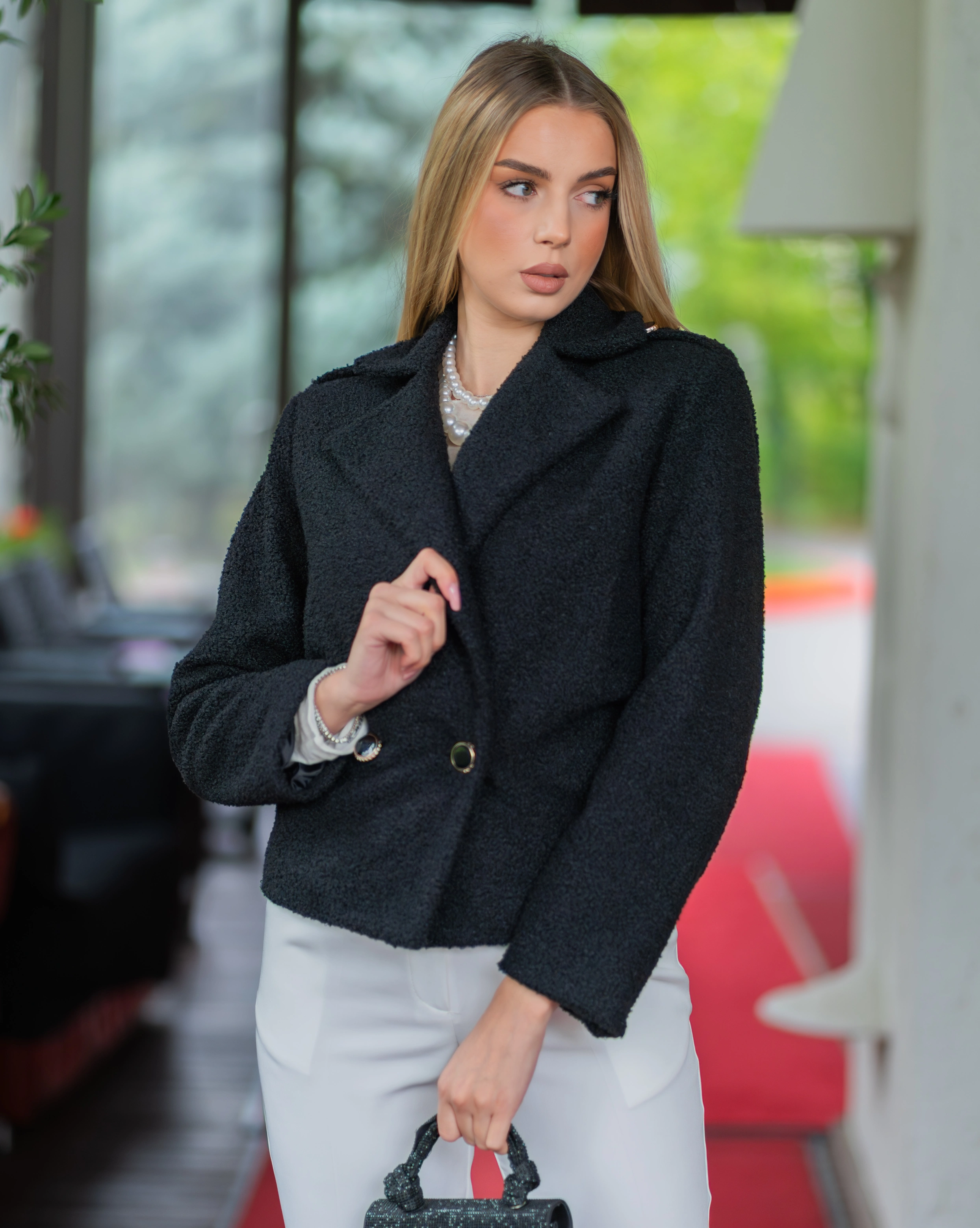 Jacheta scurtă Alma, perfectă pentru toamnă, este confecționată dintr-o stofă ușor groasă și plăcută la atingere, ideală pentru zilele răcoroase. Aceasta are un design elegant, dar totodată practic, cu o lungime care cade puțin sub talie, oferind libertate de mișcare și confort.
