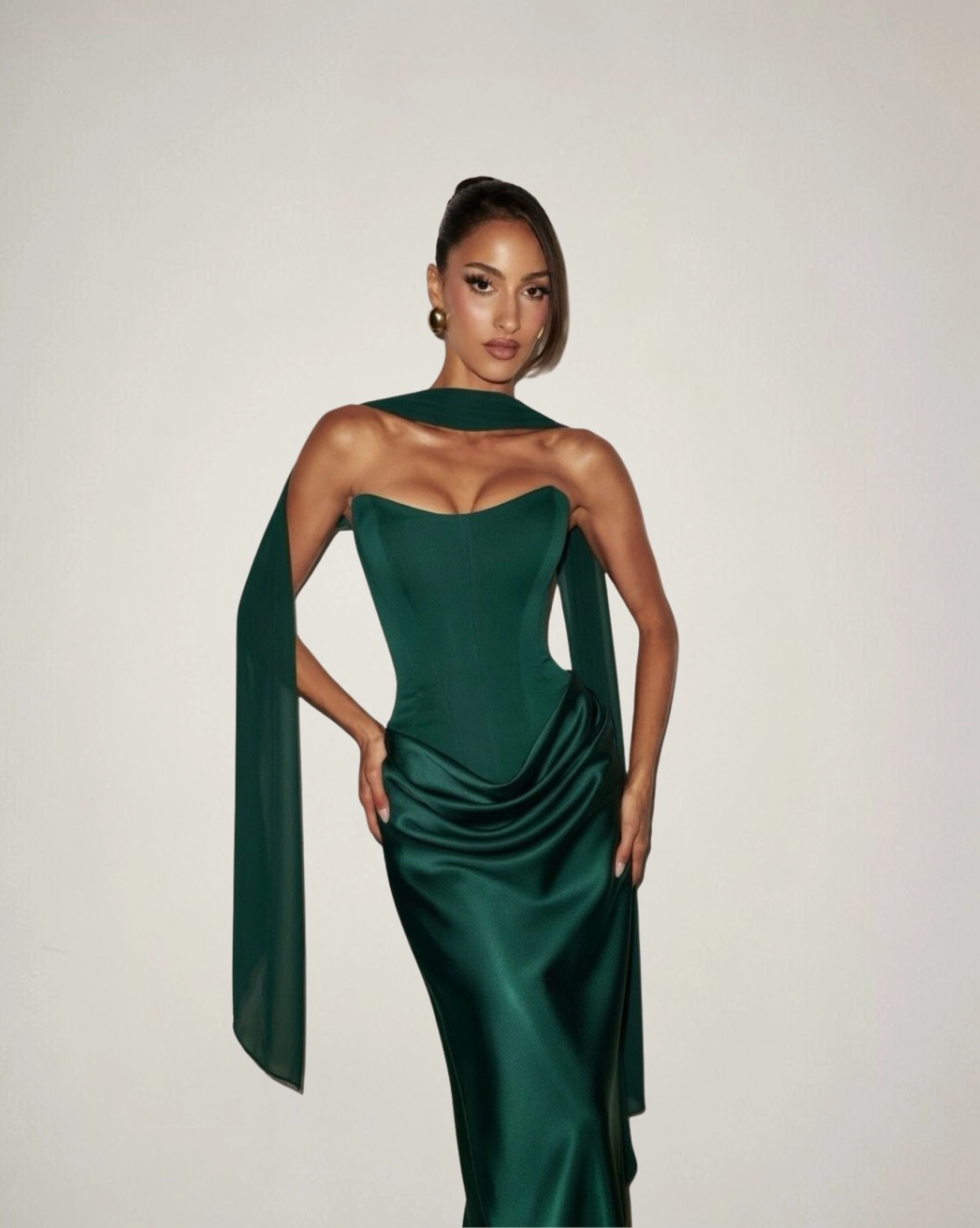 Rochia ALESSIA este definiția eleganței moderne. Corsetul structurat evidențiază linia bustului și talia, creând o siluetă feminină și sofisticată. Materialul din tafta elastică oferă o cădere elegantă și un luciu discret care adaugă profunzime întregii apariții.