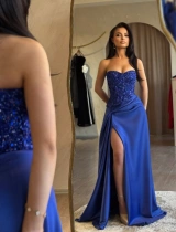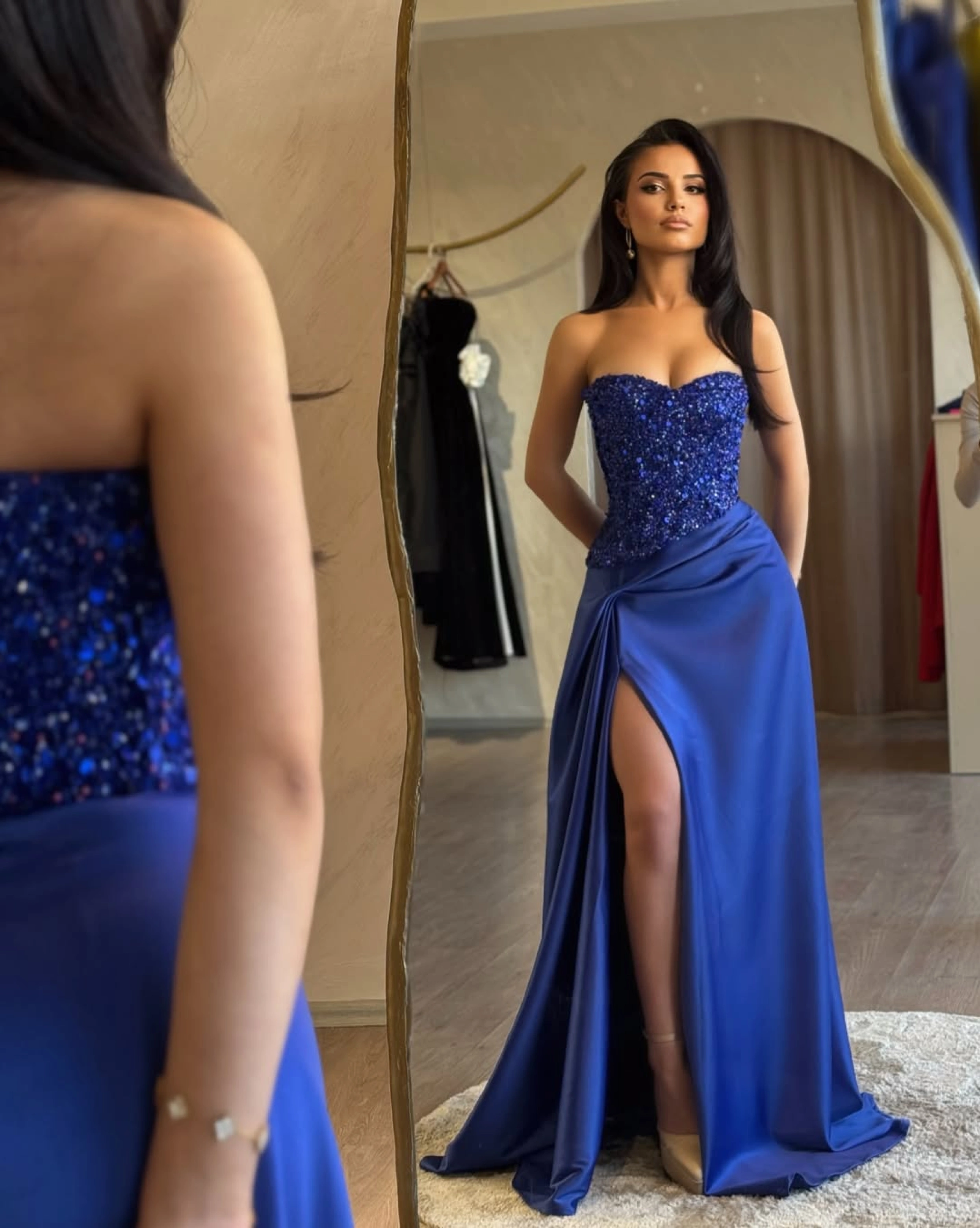 Croiala fără bretele evidențiază delicat linia umerilor, în timp ce fusta fluidă, din satin, cade elegant pe siluetă. Drapajul din talie și fanta înaltă pe picior alungesc forma corpului și adaugă un plus de feminitate și rafinament.