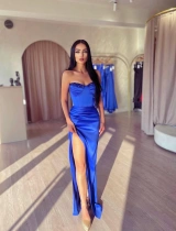Rochia lunga Anastasia albastru royal tafta bust cupe cu paiete