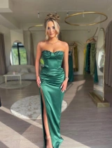 Rochia lunga Anastasia Verde tafta bust cupe cu paiete