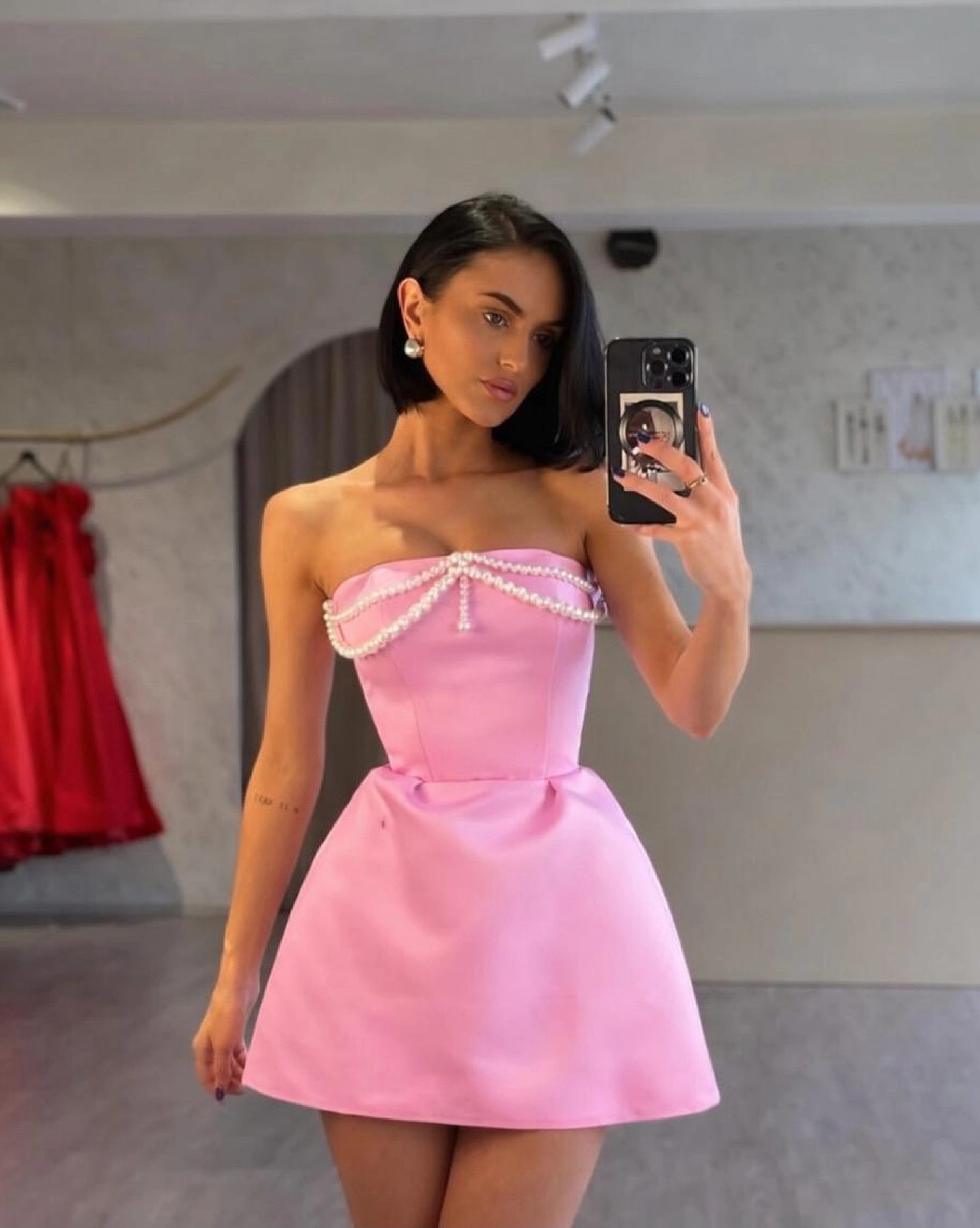 MERRA este o rochie scurtă cu aer romantic și detalii sofisticate, creată pentru apariții delicate, dar memorabile. Designul tip corset, fără bretele, evidențiază linia umerilor și conturează talia într-un mod elegant. Bustul este decorat cu aplicații fine, tip perlă, care adaugă un plus de rafinament și strălucire subtilă. Mânecile lungi, voluminoase și detașabile oferă un efect dramatic și permit transformarea ținutei într-o variantă mai minimalistă.