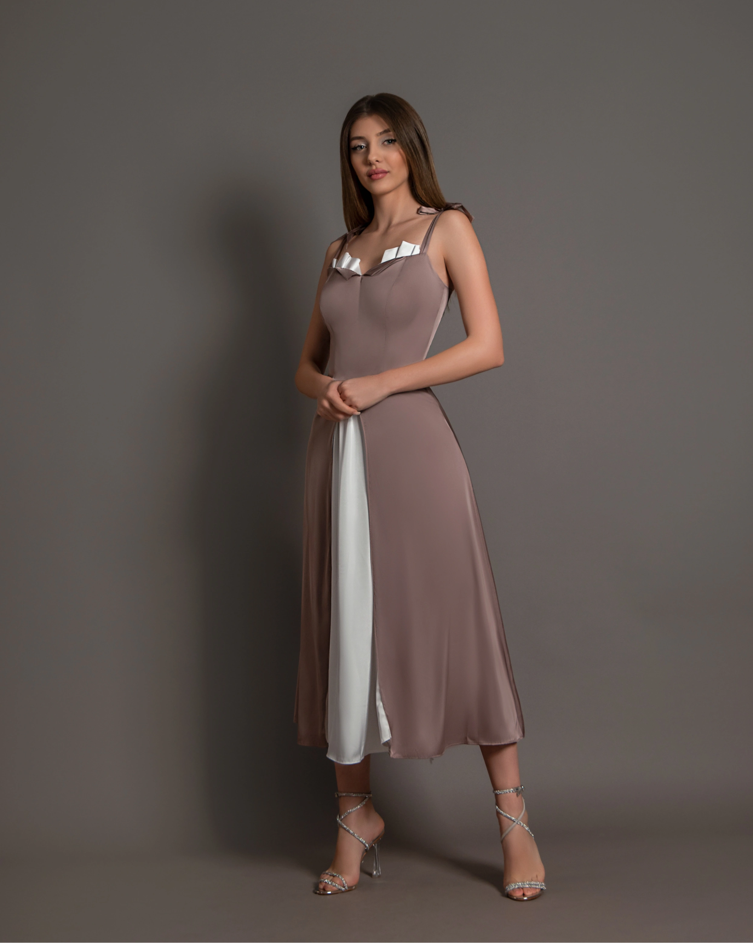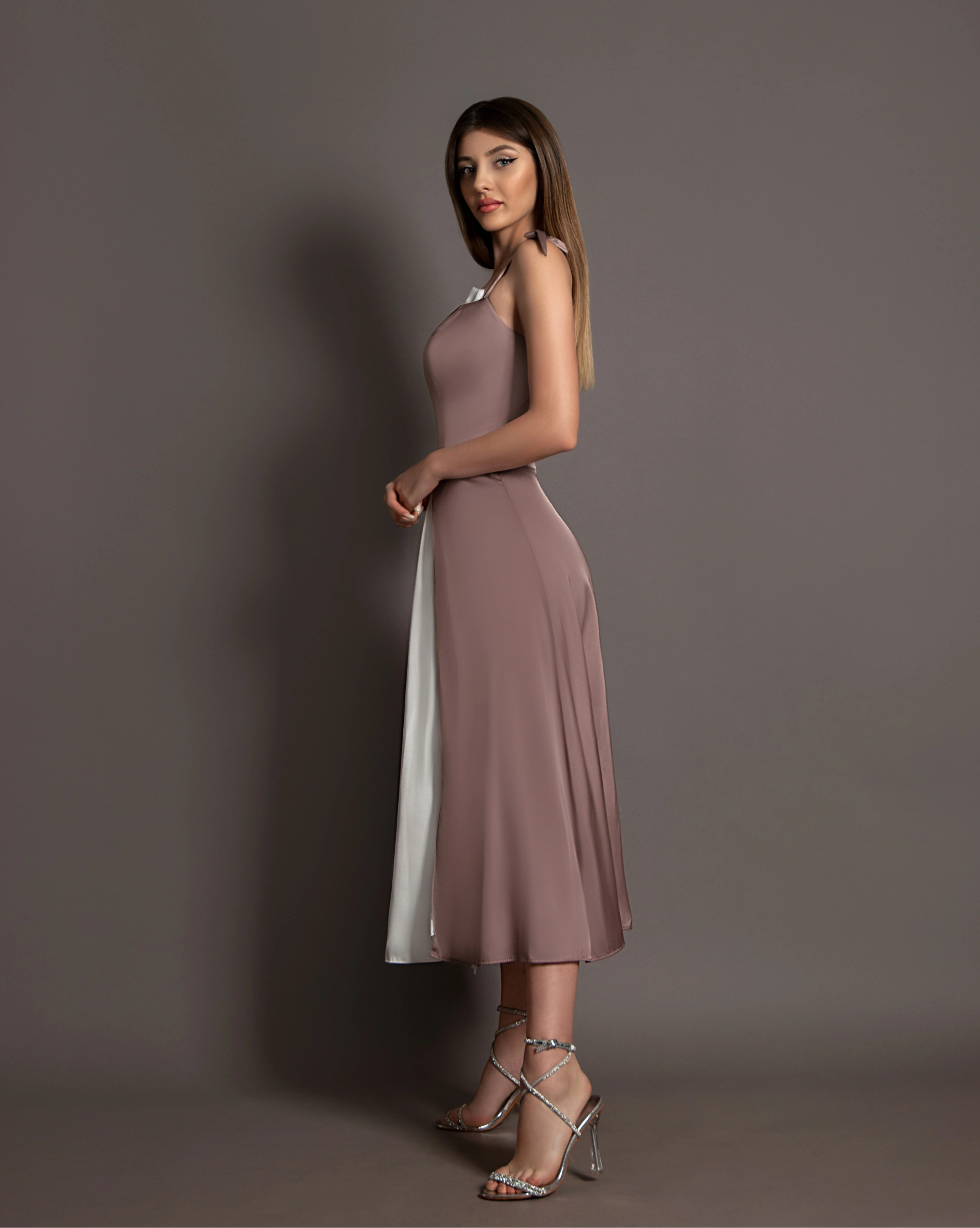 Rochia Anais este midi cu fustă fluidă și design inedit este o piesă elegantă și sofisticată. Fusta vaporoasă curge delicat pe lângă corp, oferind o mișcare grațioasă. Cele două crăpături laterale, amplasate strategic pe picioare, evidențiază subtil și senzual silueta, adăugând un element de îndrăzneală și rafinament. Designul inovator al rochiei atrage atenția prin detalii unice, combinând eleganța clasică cu un stil modern și atrăgător.