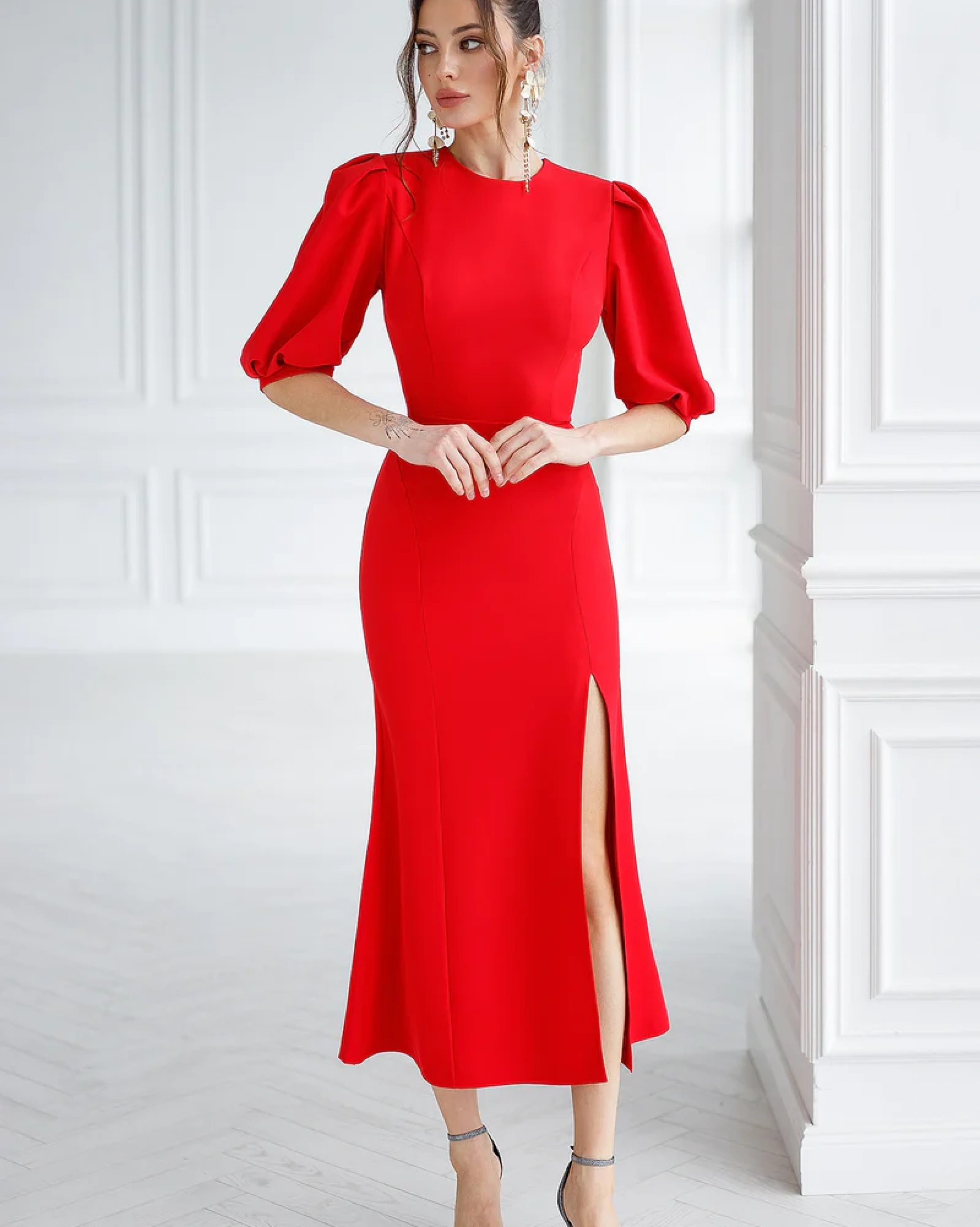 Manecile 3/4, bufante adaugă un aer retro și sofisticat, iar decolteul elegant la baza gâtului subliniază cu subtilitate linia gâtului. Despicătura fermecătoare pe picior îmbină feminitatea și senzualitatea, fiind alegerea perfectă pentru evenimente elegante sau seri romantice.