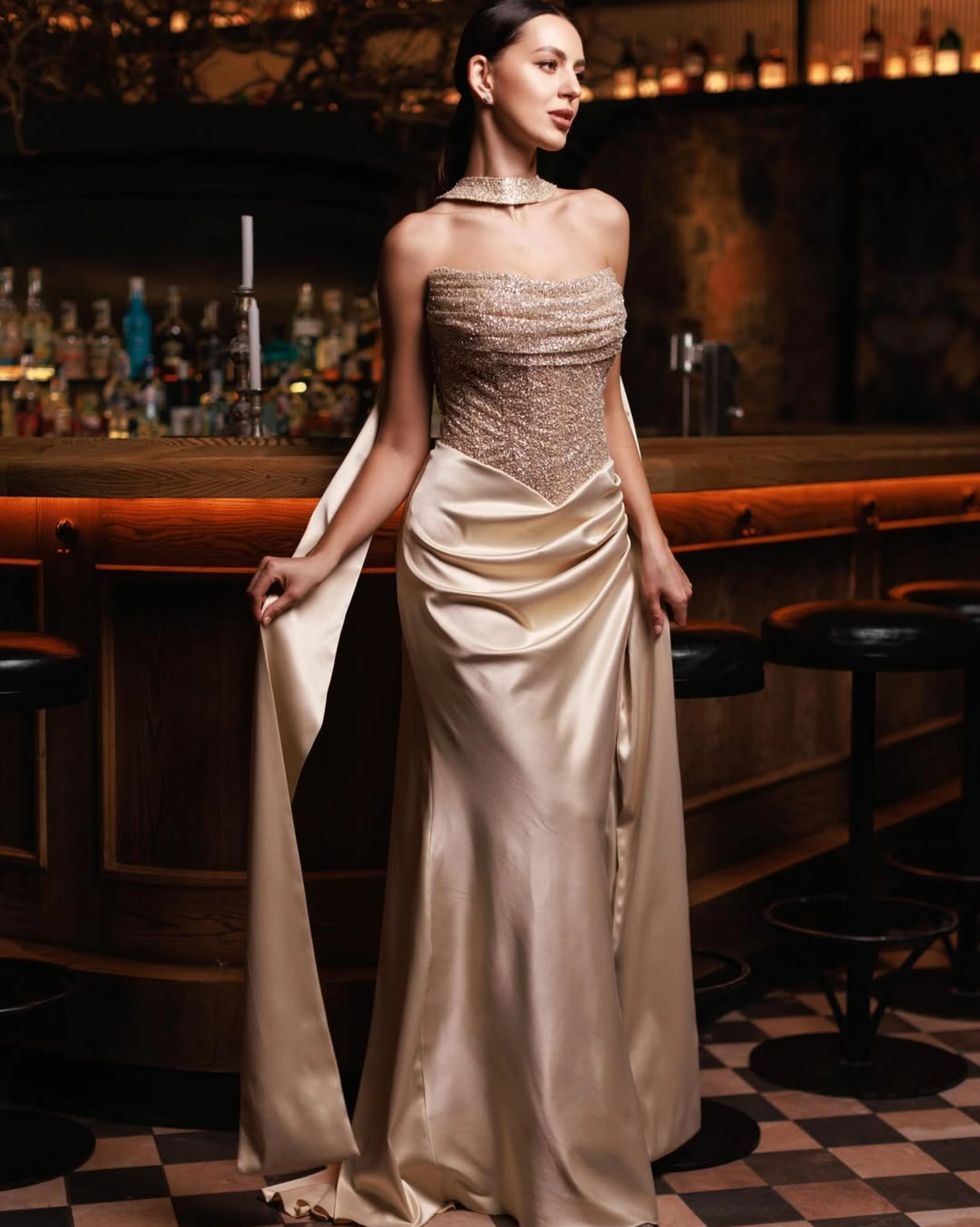 Rochia MONNA redefinește eleganța contemporană printr-un design sofisticat și o estetică impecabilă. Corsetul structurat, cu textură strălucitoare, evidențiază linia bustului și oferă susținere, în timp ce fusta din material satinat cade fluid, urmând natural silueta. Detaliul tip choker integrat adaugă un aer modern și exclusivist, transformând întreaga piesă într-o apariție memorabilă. Fiecare element este gândit pentru a crea un look echilibrat între rafinament și senzualitate, ideal pentru evenimente de seară, gale sau ocazii speciale.