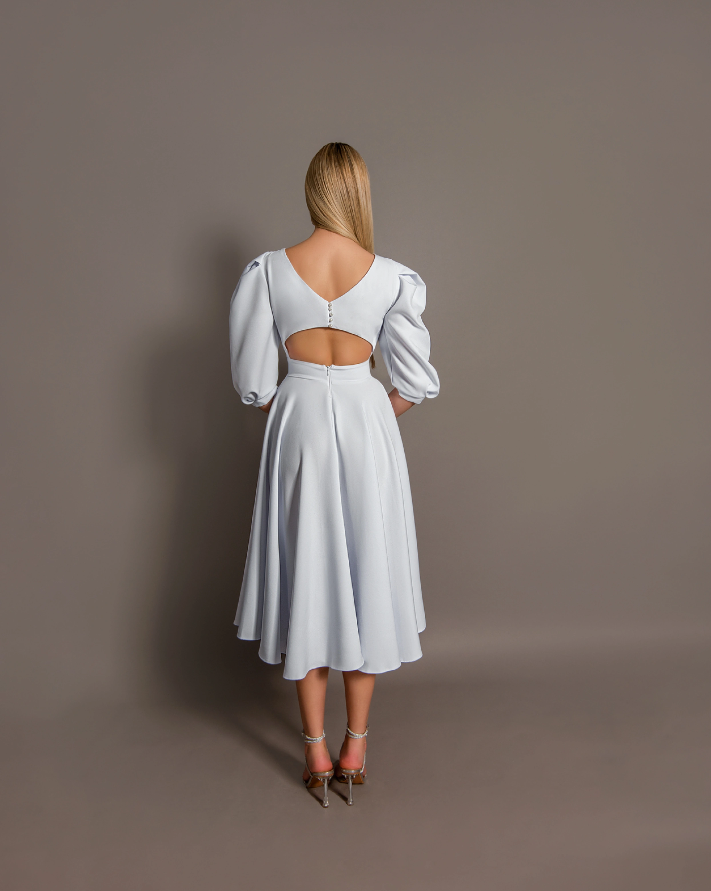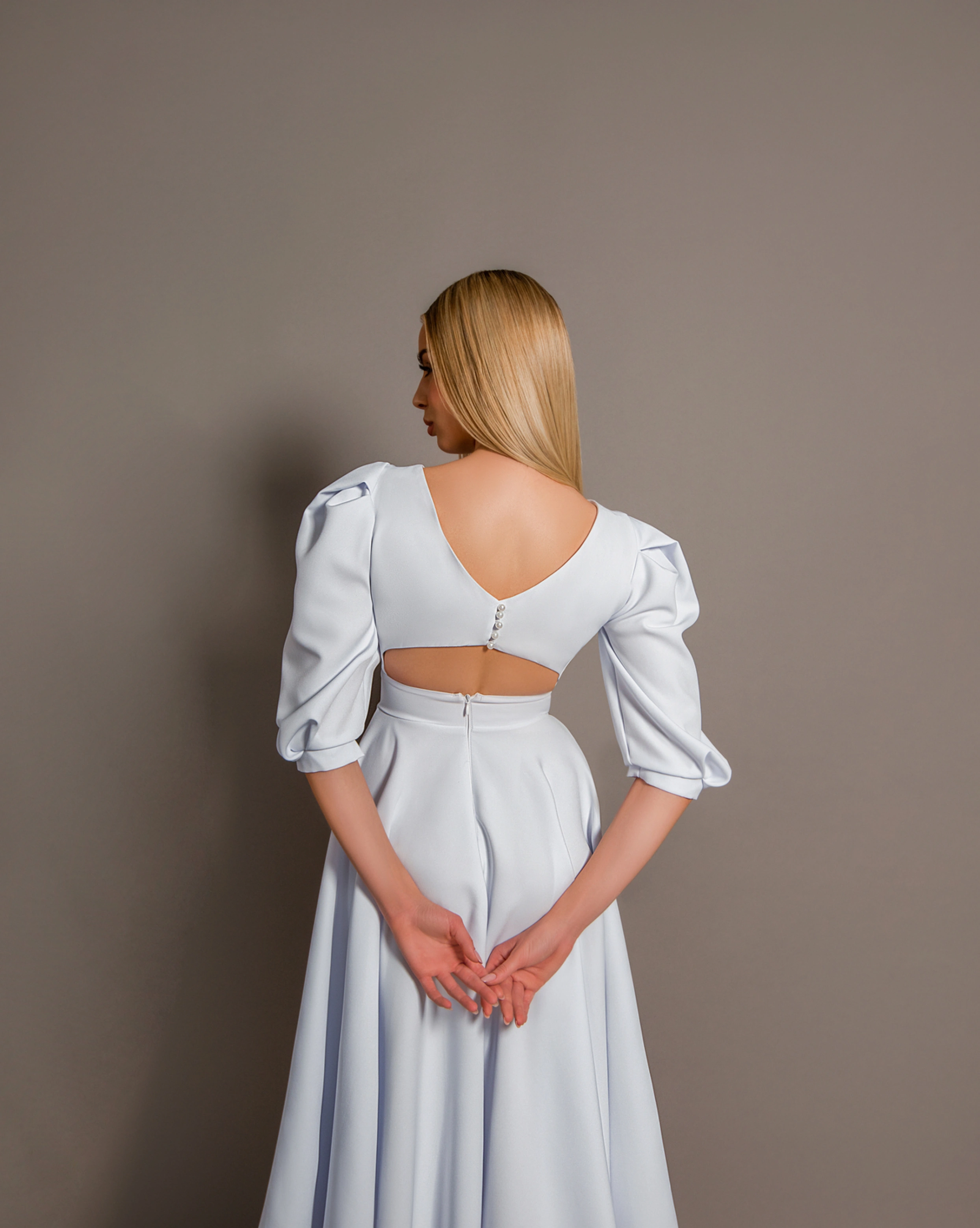 Manecile 3/4, bufante, adaugă un element de grație și sofisticare, oferind un aspect cu o notă ușor retro, dar actualizat pentru gusturile moderne. Decolteul elegant la baza gâtului subliniază cu subtilitate linia gâtului și conferă un aer sofisticat. Fusta este croita cu clos pentru a da un aer mai romantic.