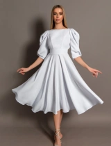 Rochie midi Elegance Alb stofa maneci bufante OUTLET