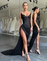 Design sofisticat cu un corset din paiete negre ce reflectă lumina în mod spectaculos și o fustă fluidă, ce oferă o combinație rafinată între glamour și senzualitate.Spatele corsetului cu șnur adaugă o notă de eleganță vintage, completând aspectul rafinat.